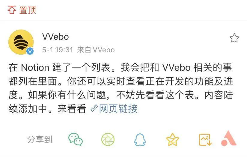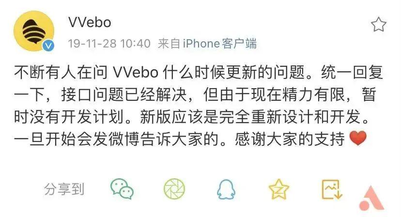 直至去年,开发者在微博上宣布 vvebo 的接口问题已经解决,会彻底重构一个全新的 3.0 版本,这让那些喜欢第三方微博客户端的用户看到了希望,那种「百家争鸣,百花齐放」的感觉又回来了,或许这就是第三方微博客户端的魅力所在。