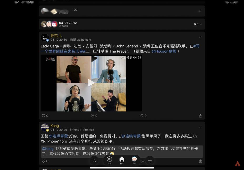 当我们想要快速查看某一条微博的评论转发时,在卡片边缘分别向右和向左滑动即可,而在非边缘位置左右滑动则变为了不同列表的来回切换。如果你并不习惯这些手势操作,也可以直接点击微博卡片中的评论转发按钮进行快速查看,方便快捷。