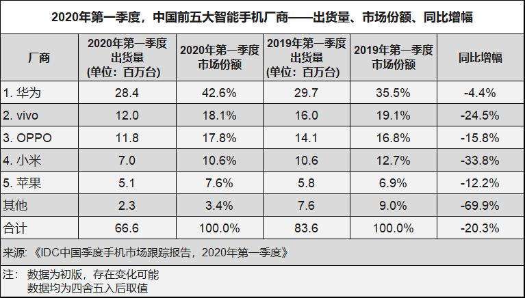与此同时,国际数据公司IDC最新出炉一季度国内手机出货量报告显示,2020年第一季度,中国智能手机市场出货量约6660万台,同比下降20.3%,疫情之下,一季度所有手机品牌无一例外地出货量出现下滑。