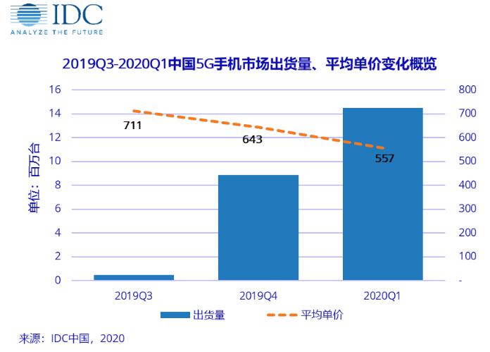 另外,5G手机正式进入市场三个季度以来,国内5G智能手机出货量累计达2380万台,而平均单价也在的迅速下探,2020年第一季度,已降至$600(美元不含税基准)以内。