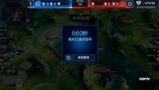 比赛的第二局Hero久凡的廉颇突然一个人从自家的中塔往对面的中塔走,并且直接走进了塔下,而GK这边周瑜和鲁班大师应该都反应过来肯定是卡了,青枫也就直接停手了。果不其然,在久凡被防御塔打死之后裁判叫了暂停,其实这时候发现不只是廉颇一个人卡了,Hero的所有人几乎都不动了,明显是俱乐部的网络出了问题。而在经过了调整之后,裁判进行了时光倒流,廉颇又重新回到了没死的时候。