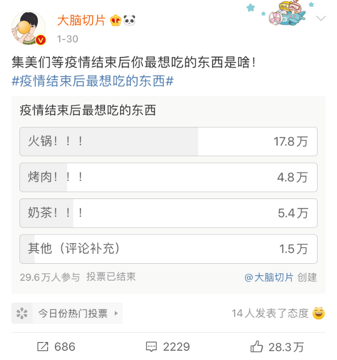 一位博主曾在疫情期间发起投票,问网友疫情结束后最想吃什么?
