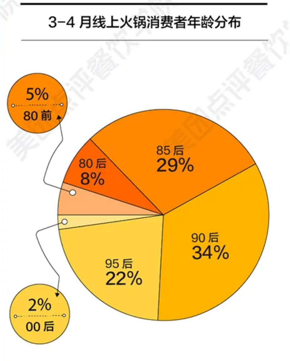 以美团点评发布的“3-4月火锅线上用户画像”为例。数据显示,作为率先复苏的餐饮品类,火锅有超过87%的消费数据来自于35岁以下的人群(其中85后29%、90后34%、95后22%、00后2%)。