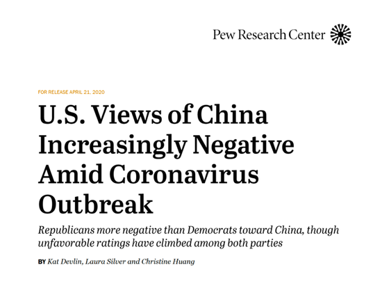 今年的调查于4月21日发布,全文标题为:《新冠疫情期间,美国对中国负面观感的增长情况》(U.S. Views of China Increasingly Negative Amid Coronavirus)。