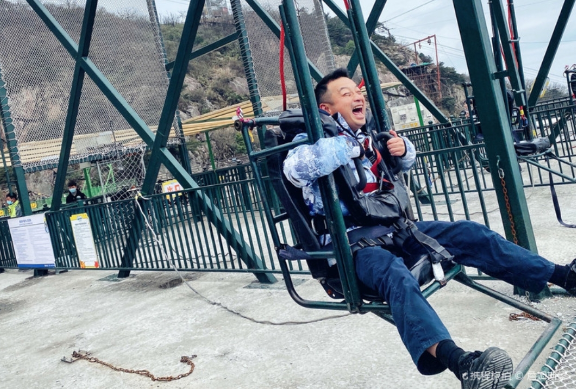 (梁建章在安吉直播间隙,体验“悬崖秋千”)