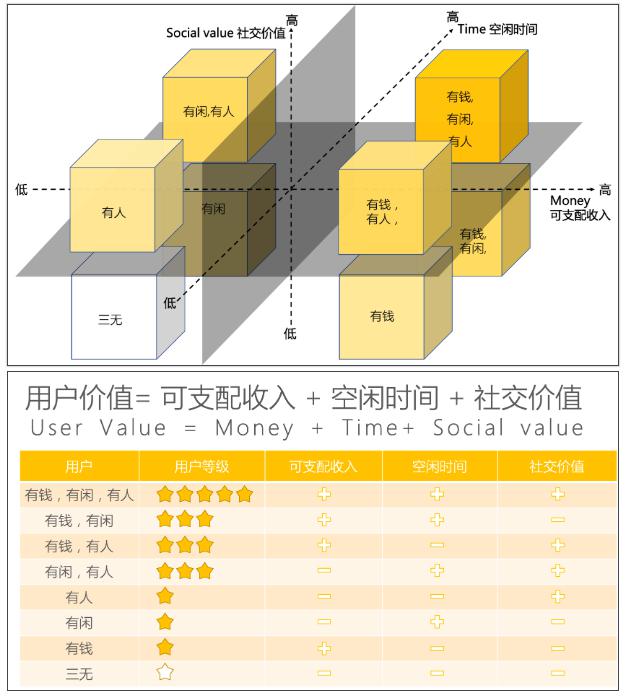 用户价值=可支配收入+空闲时间+社交价值