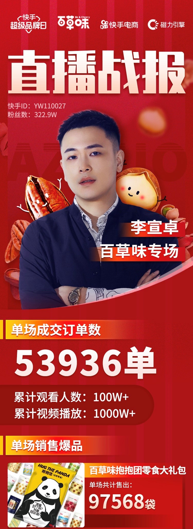 再往前则是百草味的快手超级品牌日专场。快手主播李宣卓是此次的品牌发现官,最终成交额突破100万,单场订单数超2万单。其中百草味抱抱团网红礼包成交额超16万,是本场直播最受欢迎的爆品。