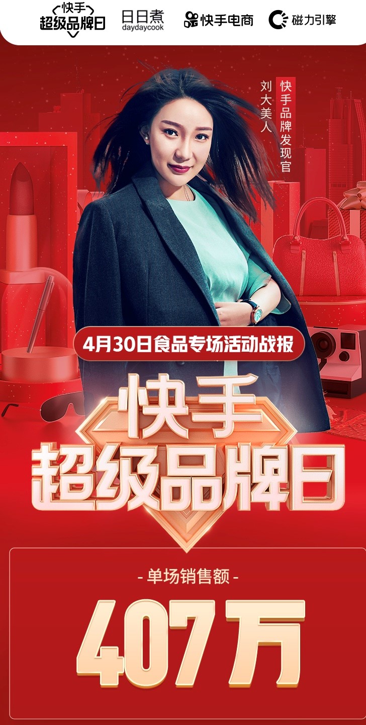4月30日,快手超级品牌日携手品牌发现官“刘大美人”带来日日煮和洽洽食品专场,单场销售额超过400万,累计观看人数达到300万。
