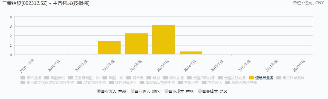 然而,引进后的速易达并没有取得稳定的营业收入。三泰控股速递易业务营收在2016年、2017年均不及引进速易达之初的2015年,营业收入分别为3.09亿元(2015年)、2.24亿元(2016年)和1.42亿元(2017年)。