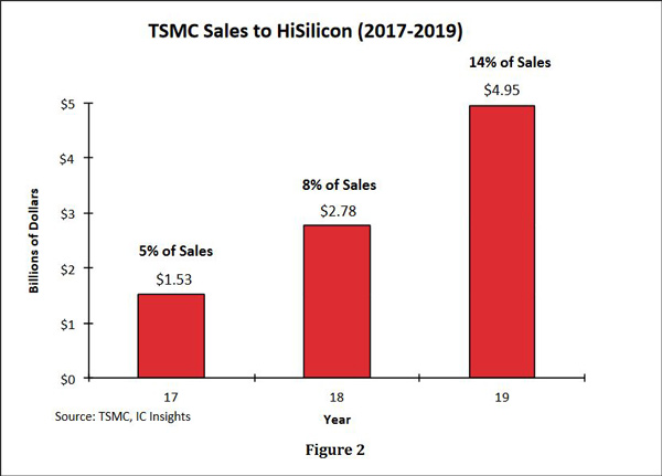 有意思的是,海思是台积电的重要客户。IC Insights指出,前者占后者的营收比重自2017年的5%,大幅上升至2019年的14%。去年海思与苹果合计为台积电贡献了37%的营收。