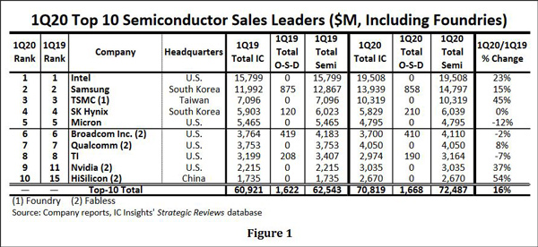 IC Insights数据还显示,2020年第一季度排名前十的半导体公司销售额同比增长16%,是全球半导体行业同比增长幅度(7%)的两倍以上。