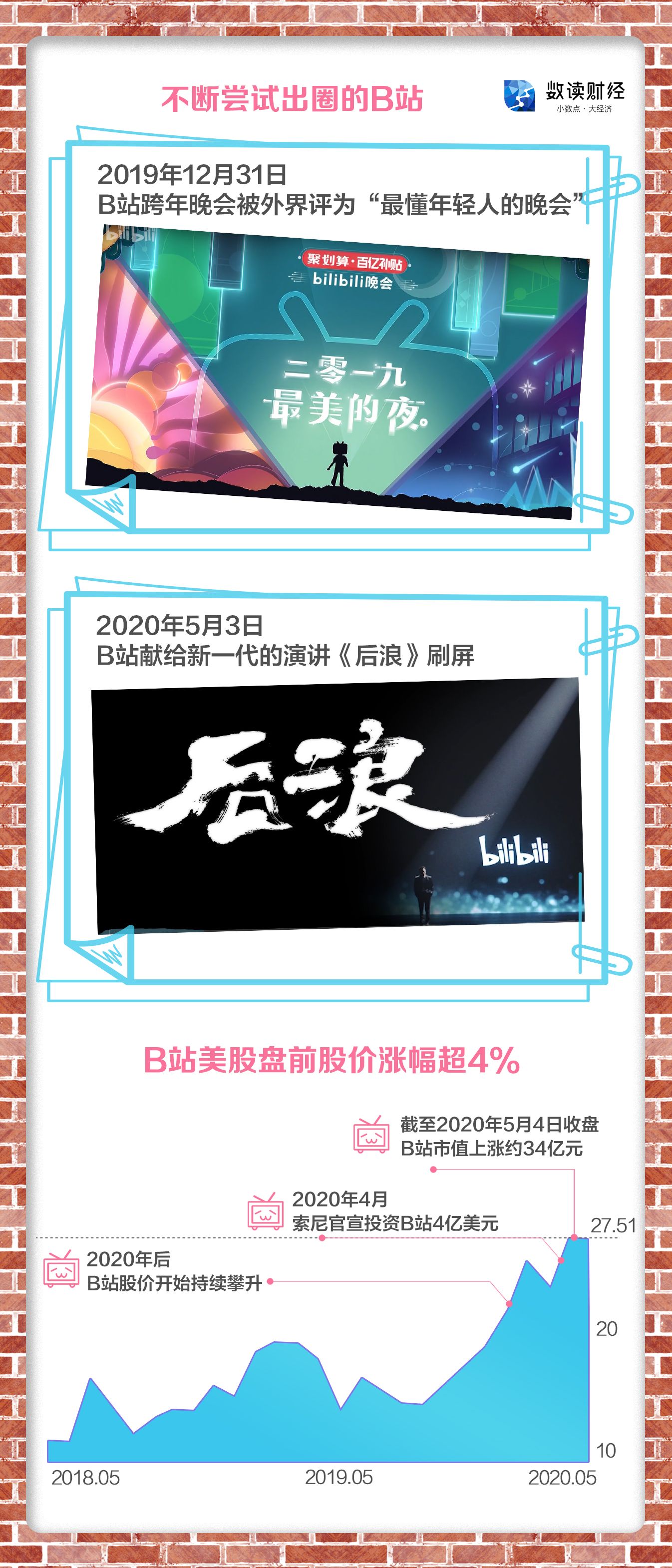而《后浪》刷屏之后,B站美股盘前涨超4%;北京时间5月4日晚间,B站的股价一改连日下跌的颓势,开盘大涨,股价一度涨近8%,市值上涨约48亿元人民币。