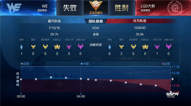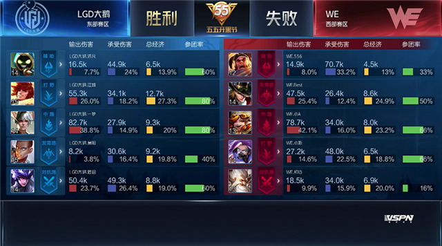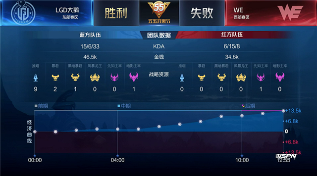 开局WE关羽抢红成功。2分30秒,LGD.大鹅嫦娥击杀WE裴擒虎拿下一血。同时二连击破,抢下第一条暴君。4分20秒,LGD.大鹅团战打出1换1,击杀先知主宰。6分30秒,LGD.大鹅越塔击杀WE裴擒虎,推掉中路一塔,击杀暴君。8分35秒,LGD.大鹅团战0换2,推掉上路二塔,经济领先6k。10分,中路再次爆发团战,LGD.大鹅打出2换2,推掉中路二塔。11分45秒,LGD.大鹅击杀黑暗暴君和主宰。13分25秒,LGD.大鹅强推下路高地。15分,LGD.大鹅强冲水晶团灭WE,一波拿下比赛胜利。