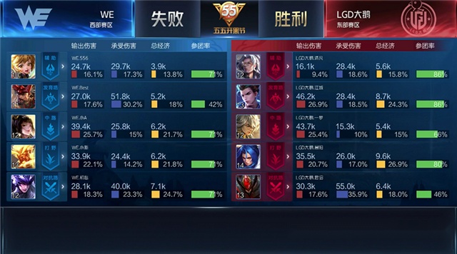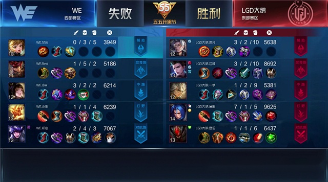 开局双方和平发育。0分50秒,LGD.大鹅入侵蓝Buff野区,裴擒虎击杀WE苏烈拿下一血。3分25秒,WE苏烈接连控制,配合马可波罗击杀WE马超。5分20秒,LGD.大鹅太乙真人闪现大招救下张良,LGD.大鹅打出0换1。5分40秒,LGD.大鹅马超上路单杀WE马可波罗。7分40秒,LGD.大鹅太乙真人闪现大招眩晕三人,团战打出0换2。8分34秒,LGD.大鹅团战0换2,推掉WE中、下两路高地,经济领先近1W。10分32秒,LGD.大鹅击杀主宰。12分58秒,LGD.大鹅发起总攻,激烈团战后打出4换5。裴擒虎三连决胜,一人推掉水晶。
