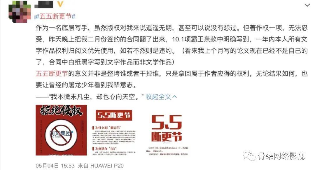 一石激起千层浪,阅文方的回应也没能阻止事态蔓延。在5月3日,阅文通过官方账号发布系列“恳谈会”安排,并把时间确定在了5月6日。不过,在恳谈会将要开始的前几个小时,在5月5日晚,网文作者们“揭竿而起”,呼吁大家团结在一起停止码字,55断更节由此诞生。