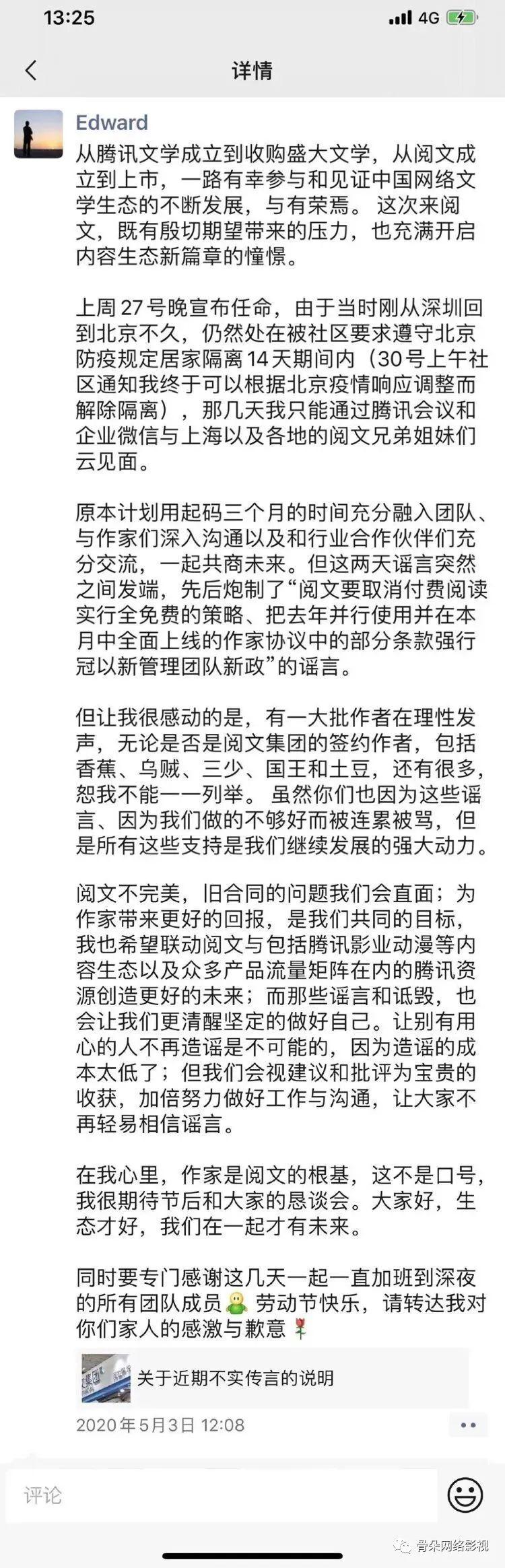 5月6日下午,阅文发布《明辨虚实,理性发声》的辟谣文章,对网络上传的“全盘免费”、“新合同推出,知名作家断更”、“侵吞去世作家收益”、“作者没有著作权”等相关问题一一进行回应,骨朵随即也采访了阅文方人员,部分核心问题获得回应。