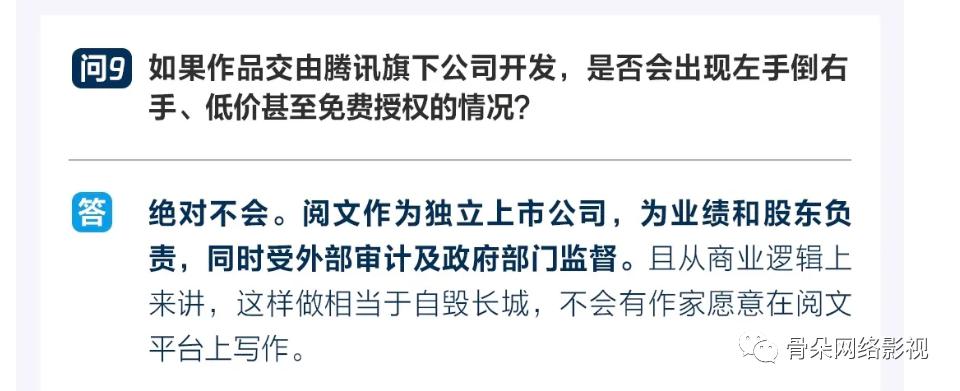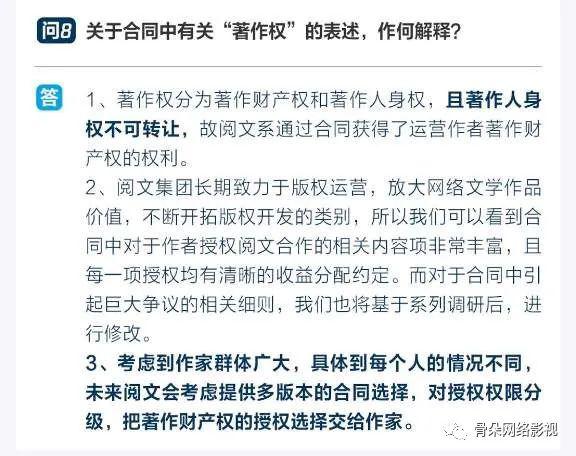 不过,在备受争议的著作权问题上,无论是在恳谈会上的回复,还是骨朵再次询问阅文,回答则都相对模糊。在官方回应里,未来会提供多版本合同供不同作者选择,对授权权限分级,但对于再具体的细节,高层还在商议,目前暂时回答不了。