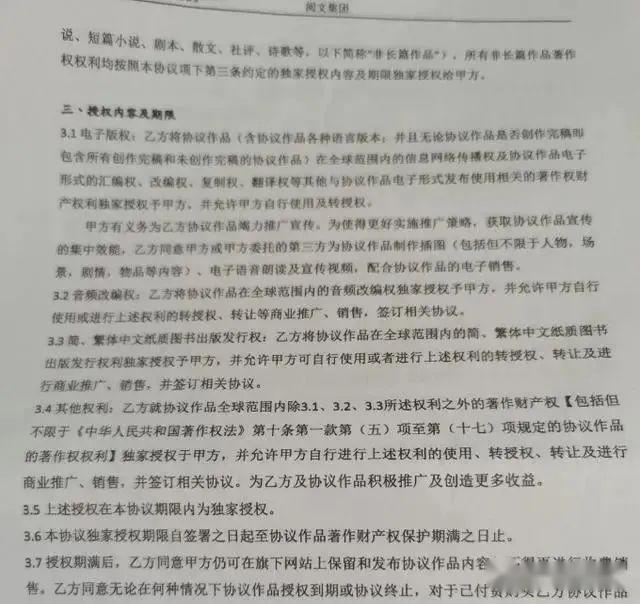 但备受争议的“聘请”字眼,让网文作者们有了创作的作品与平台变为“委托创作关系”的疑虑,“阅文与作者之间签订的合同名为《文学作品独家授权协议》。根据名称和内容来看,该协议仍是乙方对其所创作的文学作品授权给甲方的约定, 并不会因为协议中的某个字眼的使用而改变了整个合同的性质。”郑小强律师表示,这一合同,是作者自主创作后在阅文平台上发表并将作品授权给平台使用的法律关系。