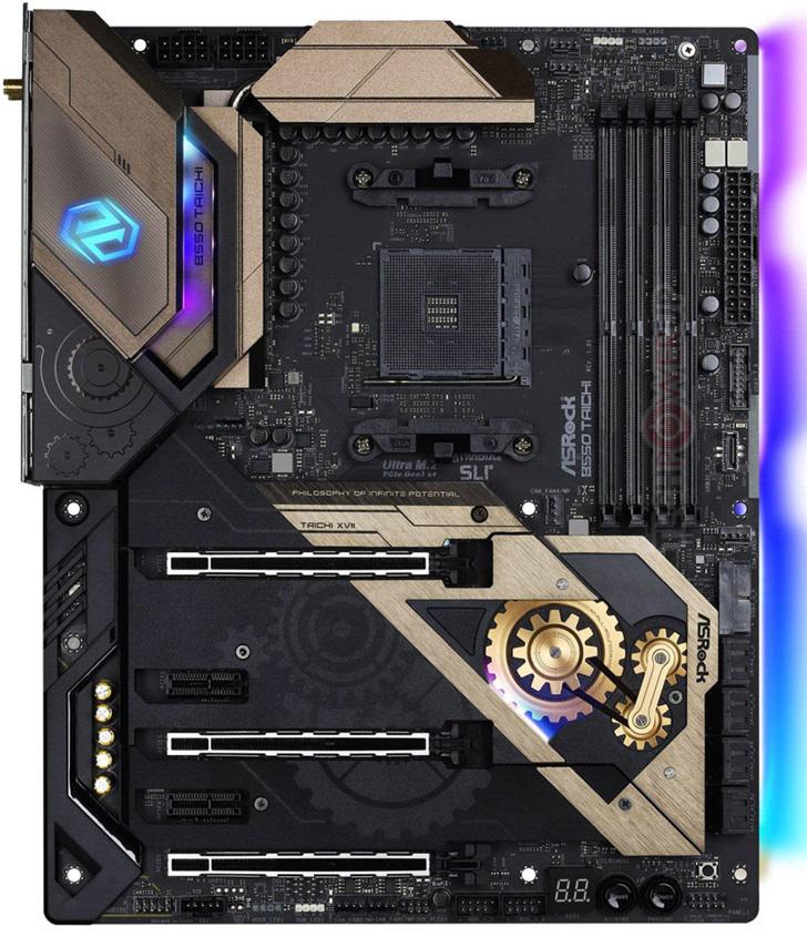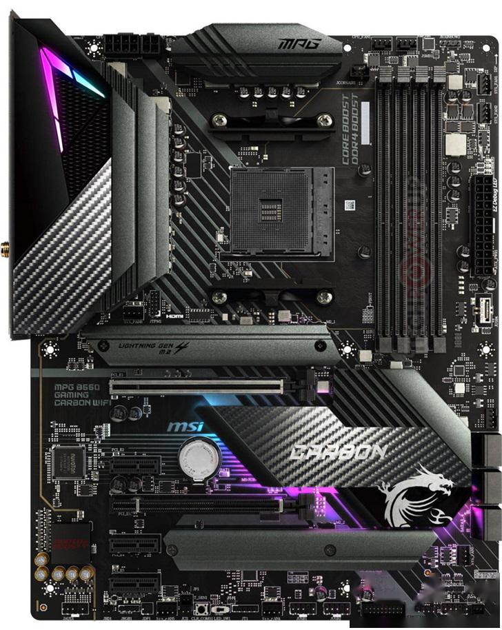 如图所示,B550主板支持PCIe 4.0 ×16的显卡,支持PCIe 4.0 SSD,CPU通过4条PCIe 3.0与芯片组连接。以下是几款B550主板的图片。IT之家曾报道,华擎、华硕、映泰、七彩虹、技嘉和微星等ODM合作伙伴预计将从2020年6月16日开始在全球销售AMD B550主板产品