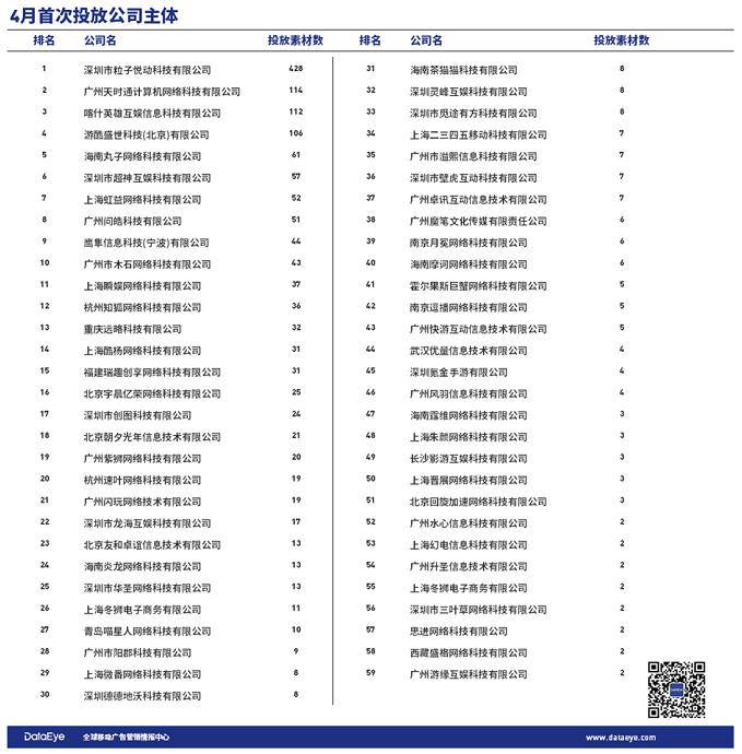 4月首次投放公司共59家,TOP3分别为深圳市粒子悦动科技有限公司,广州天时通计算机网络科技有限公司,喀什英雄互娱信息科技有限公司,以网赚产品为主。