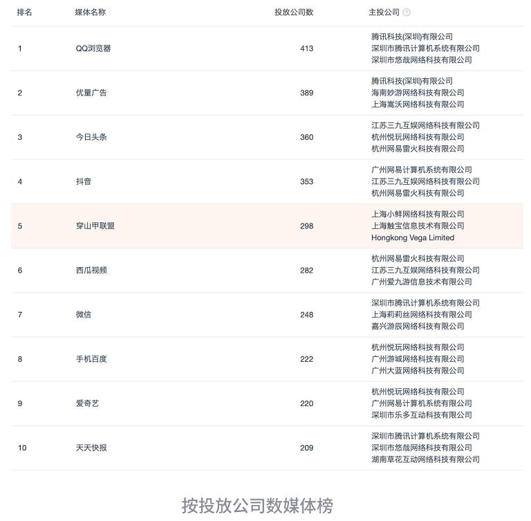 以投放公司数为主,媒体榜单TOP10中,QQ浏览器4月在投公司主体最多,为413家;优量广告排第2,在投公司主体413家;今日头条在投公司主体360家。