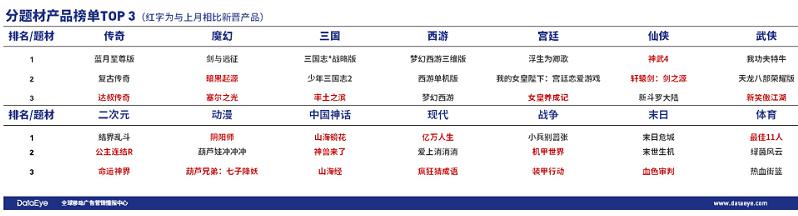 4月各题材产品榜TOP3中,中国神话题材变动最大,上榜的三款产品与3月相比均是“新”产品,分别是《山海镜花》、《神兽来了》和《山海经》;动漫题材中,《阴阳师》拿下买量TOP1;《神武4》为仙侠题材的TOP1。
