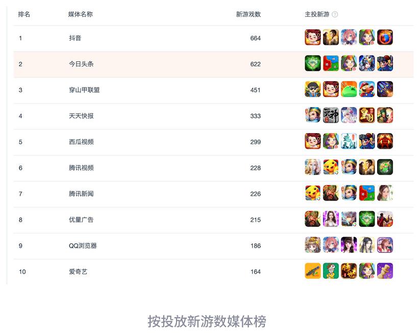 以投放新游数为主,媒体榜单TOP10中,抖音仍是最受欢迎的平台,4月新投游戏共664款,包括《疯狂收租婆》、《海岛纪元》等;今日头条位居第2,4月新投游戏622款,包括《无限切割-暴击》、《三国孙权传单机版》等;穿山甲联盟第3,4月新投游戏451款,包括《王富贵的垃圾站》、《疯狂收租婆》等。