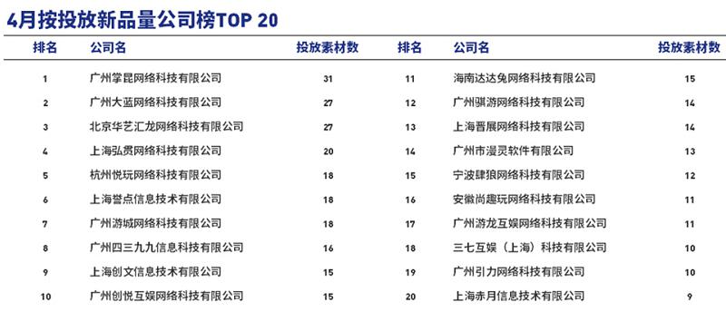 4月按投放新品量公司榜TOP20中,广州掌昆网络科技有限公司当月投放新品31款,排名第一;广州大蓝网络科技有限公司和北京华艺汇龙网络科技有限公司分居2、3名,投放新品数同为27款。