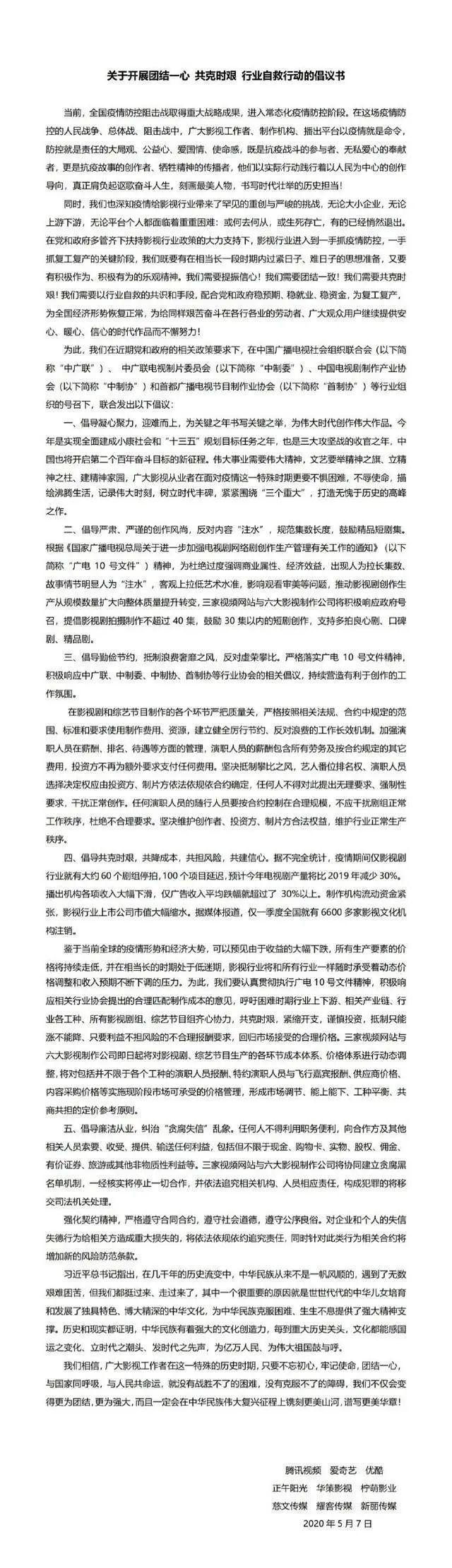 5月7日,3个视频平台(腾讯视频、爱奇艺、优酷)和6家影视公司(正午阳光、华策影视、柠萌影业、慈文传媒、耀客传媒、新丽传媒)联合发布影视综合行业自救行动倡议书。