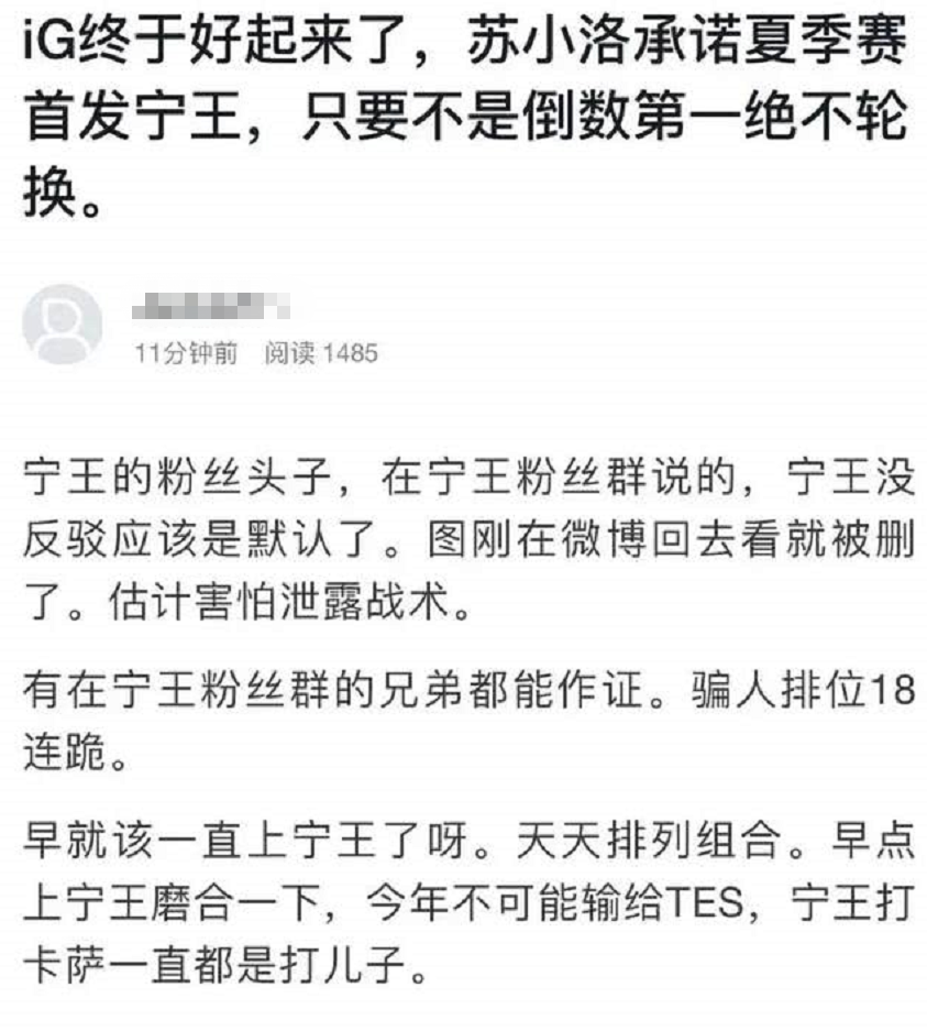 细心的网友发现,IG的经理苏小洛给粉丝们带来了一个好消息,这个好消息就是在今年的夏季赛当中,宁王即将一直首发,因为小乐言在春季赛当中,并没有打出非常亮眼的表现,所以在今年的夏季赛当中,除非IG成为了倒数第一,不然IG的首发打野就一直都是宁文!