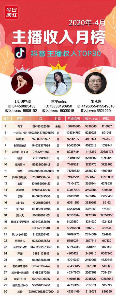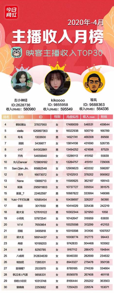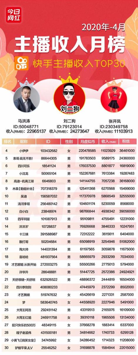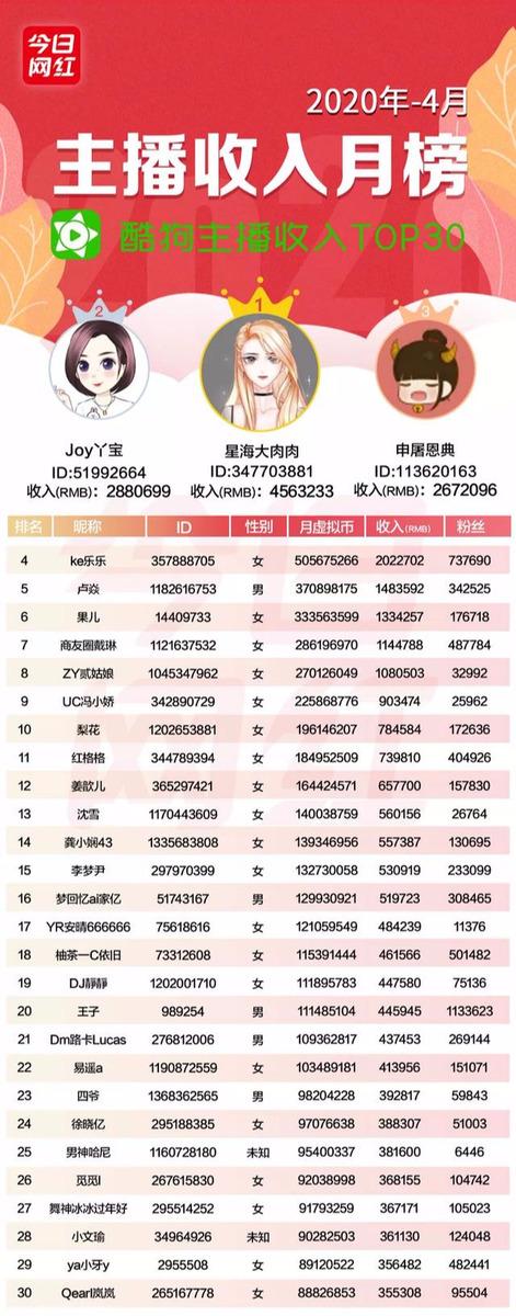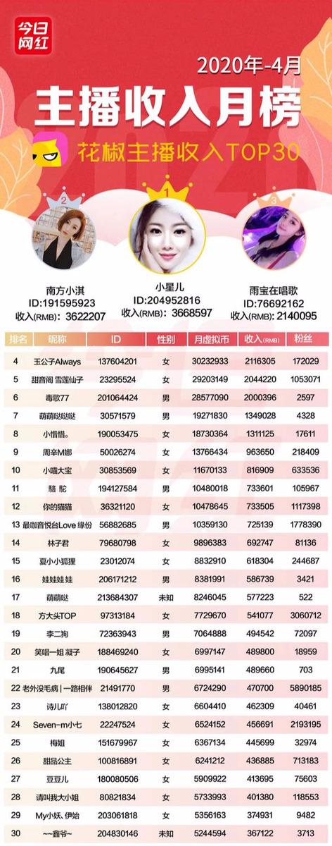酷狗主播“星海大肉肉”,收入456万,排名第20。花椒主播“小星儿~”收入366.8万,排名第26。4月,快手、抖音头部主播表现佳。