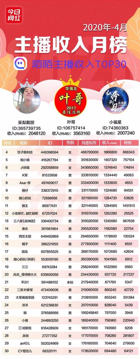 4月,快手头部主播收入2.99亿,抖音收入2.87亿,陌陌则以9641万月收入排名第三。