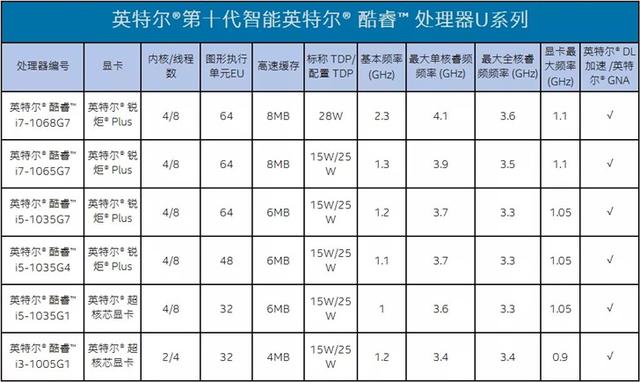 具体到产品线上,以U系列的旗舰型号酷睿i7-1068G7为例,它支持4核8线程,8MB三级缓存,TDP 15W/ 28W,基础频率2.3GHz,单核最高可睿频至4.1GHz。而Y系列的旗舰型号i7-1060G7同样也拥有4核8线程,8MB三级缓存,TDP则为9W/12W,单核基础频率1.0GHz,睿频最高3.8GHz。