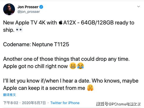 根据@Jon Prosser的消息来看,新一代的Apple TV将会搭载苹果A12X芯片,支持4K内容输出,有64GB和128GB两种规格可选,这与我们此前听到的将会搭载A14芯片的配置单有些许出入。不过A12X在图像处理能力方面有非常好的表现,配置在Apple TV中也将显著增强其对于显示图像的优化效果。