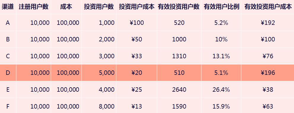 如下图所示,渠道D从新客成本角度来看,是非常优质的渠道,但是新客质量并不高,后续的留存很差,形成有效用户的比例很低,实际上是质量非常差的渠道。这就将买流量和用户增长体系打通来看的一个核心关键点。