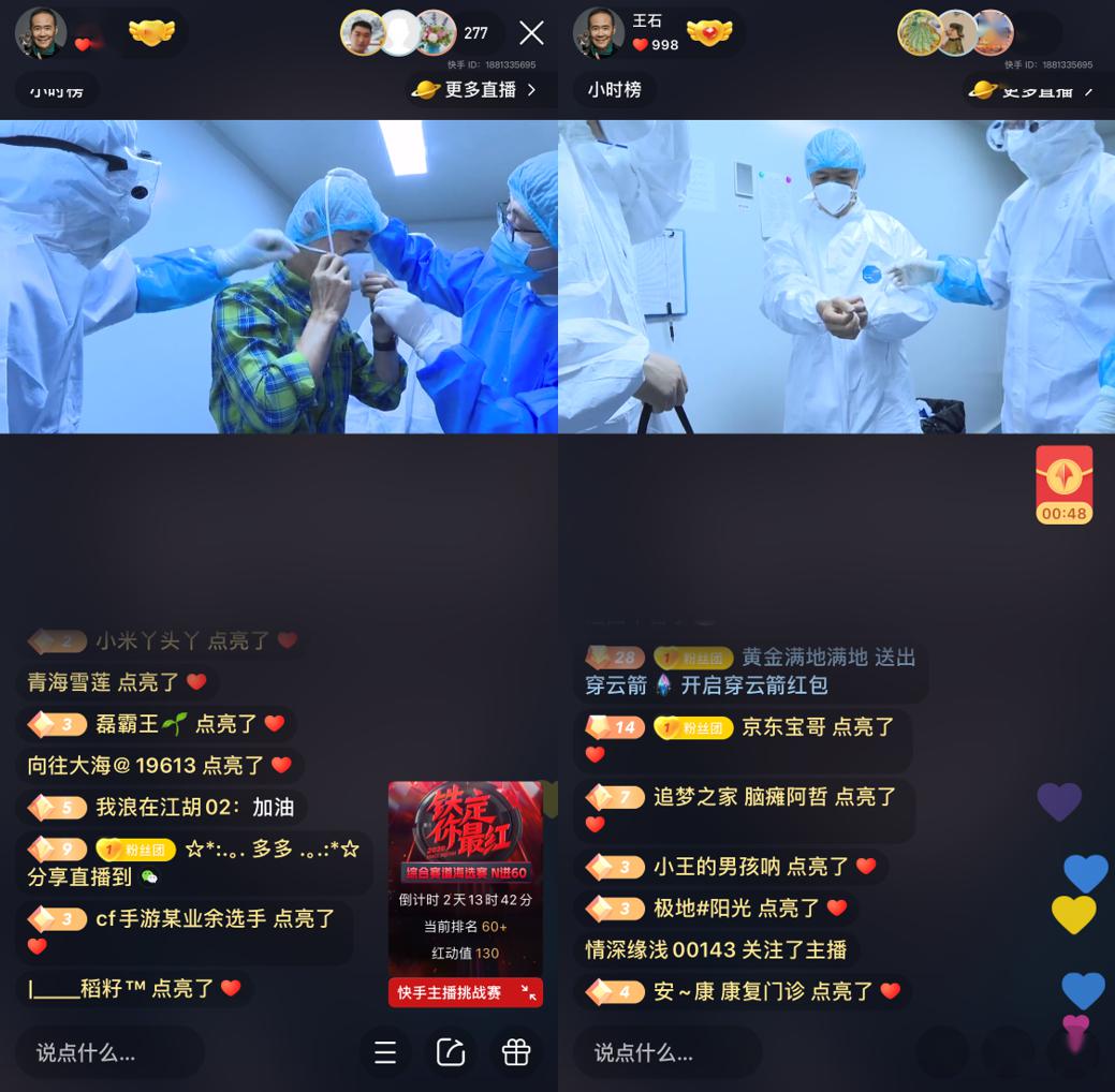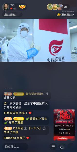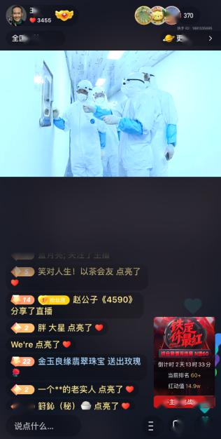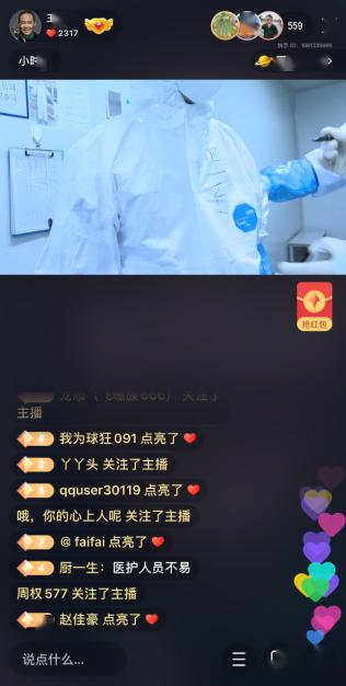聊完硬核科技,离开实验室前,还要进行“脱衣服”环节。跟随技术人员,王石进入密闭的缓冲间。“密闭空间可严格阻碍病毒带出,但对于我们直播来说,网络有可能不稳定。”一旁的王石助理吴海波跟大家提前打了声招呼。网络中断间隙,老铁们也没闲着,一波红心点亮走起。
