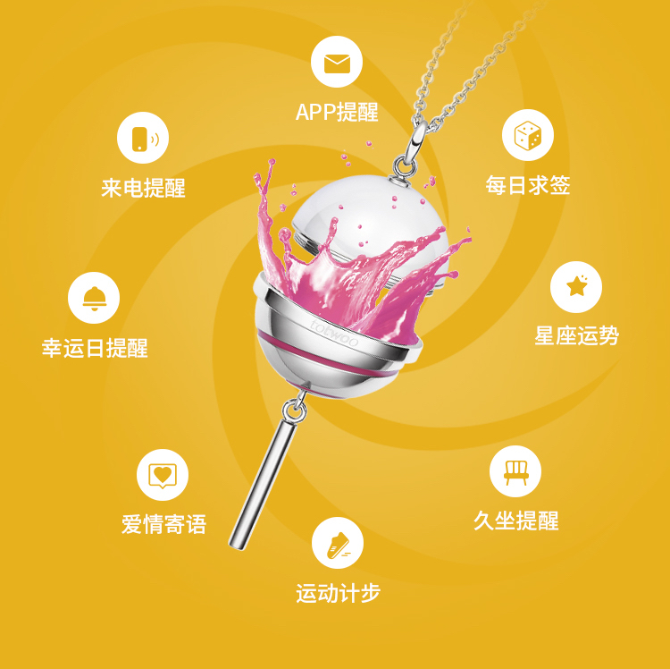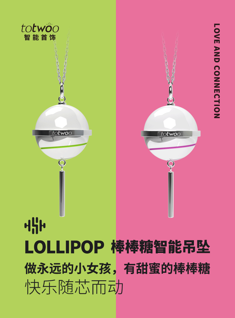 TOTWOO再次将创新极致,设计和技术团队经过10个月研发,22次打烊,将100个微小ic件和国际顶级传感器整合成一枚智能芯,通过专利结构植入到甜味十足的棒棒糖中,打造出全球第一枚俘获少女心的智能棒棒糖吊坠。佩戴的女生可以随时和棒棒糖亲密互动:随节奏闪光、取代自拍杆智能拍照、来电提醒、幸运日提醒、每日求签、星座运势、久坐提醒、运动计步等一系列功能。