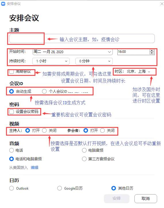 安排:按要求在弹出的界面中填入会议信息,安排一场新的会议