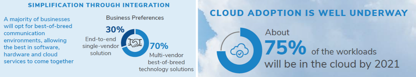 不仅如此,数据显示,有70%的企业倾向于采用多集合、多供应商解决方案的部署措施,并优先考虑灵活的协作工具,使自身不受供应商锁定,从而获得最佳的统一通信解决方案整合,涵盖音视频设备,云化的UC服务,以及管理,分析和其他支持等。
