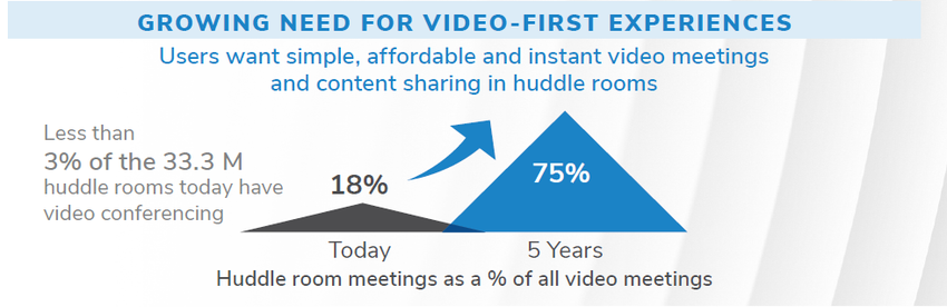 此次发布的Frost & Sullivan研究报告表明,人们对“视频优先”的体验需求正在不断增长,例如用户渴望在小型协作空间里拥有简单易用、即时且内容共享的视频会议系统。当下,只有不到3%的小型协作空间里部署了视频会议设备,但在5年内,这个比例将从18%增加到75%,充分显示视频通信的巨大潜力。值得一提的是,人工智能和机器学习将为远程协作带来更多优势,通过更深入的分析,为用户带来更优化的沟通体验和更有效的资源管理,以及帮助用户在做出决策时提供更准确的诊断条件。