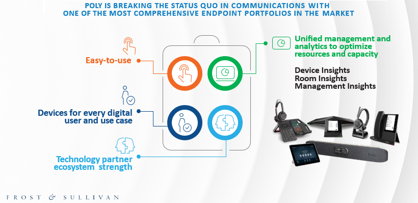 在Frost & Sullivan的电子报告中,Poly博诣所提供的解决方案打破了通信领域的现状,得到了高度的好评和认可。Poly不仅提供丰富的创新终端产品组合,并且能够配合领先的云服务,提供出色的协作体验。Poly所提供的终端设备结合了完整的服务、统一管理和下一代分析能力,能够帮助企业解决当前的使用难题,以及未来的部署挑战。