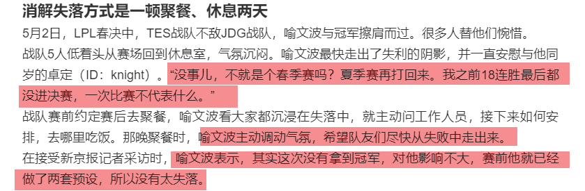 TES年龄最大的选手并不是JKL,但他却是最成熟、最稳重的选手,下面一段话是国内媒体采访TES时的场景,在春决中输给JDG之后,TES队员明显失落,休息室里气氛沉闷,JKL最先振作心情,他安慰Knight:没事,不就是个春季赛吗?夏季赛再打回来,我之前18连胜最后都没进决赛,一场比赛不代表什么!