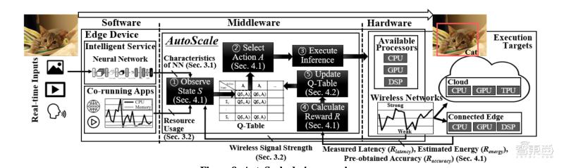 AutoScale采用一种轻量级的强化学习技术进行持续学习,可以捕捉和适应随机的环境变化。在运行过程中,AutoScale会观察和收集神经网络的层特征、Wi-Fi信号稳定性、处理器利用率等信息,并据此作出使DNN能效、性能最大化的决策。