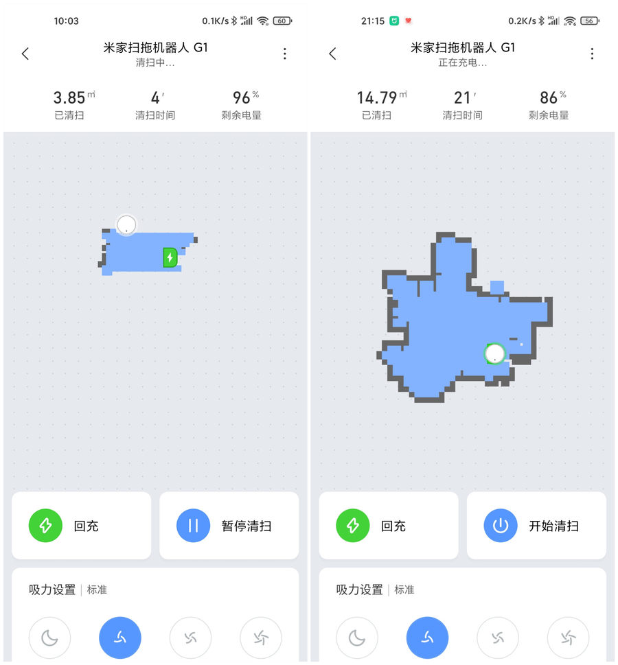 米家扫拖机器人G1支持接入米家APP,可以远程遥控米家扫拖机器人G1工作,同时在米家APP中可以查看清扫的数据,包括清扫面积、清扫时间以及剩余电量信息。米家扫拖机器人G1拥有2500毫安时的电池容量,在标准档位下能够工作90分钟的时间。