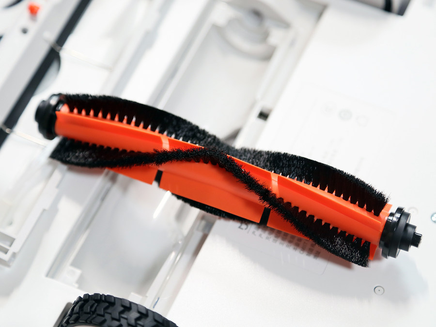 米家扫拖机器人G1的主刷外有个保护的框架,按住两端的卡扣即可拆下外部框架,取下主刷头。我们可以看到,在主刷头上的刷毛一侧还有硅胶条,实现封闭式的吸尘,同时头发、线头等缠绕主刷时,也会被硅胶条撑起,方便割断清理。