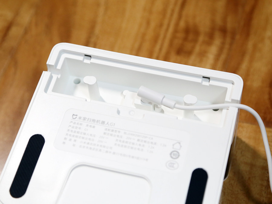 米家扫拖机器人G1的充电桩也是白色的配色,与机身相搭配。在充电桩面预留了理线槽,可以将多余的天线隐藏在理线槽内,并有盖板进行遮挡,可以让充电桩紧贴墙面,提升美观程度。