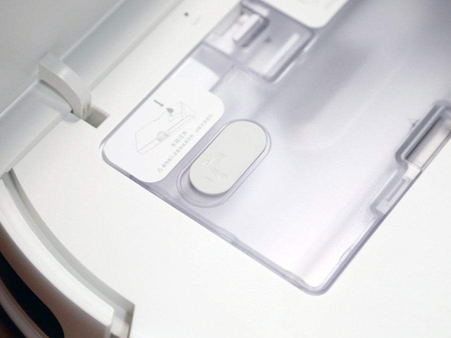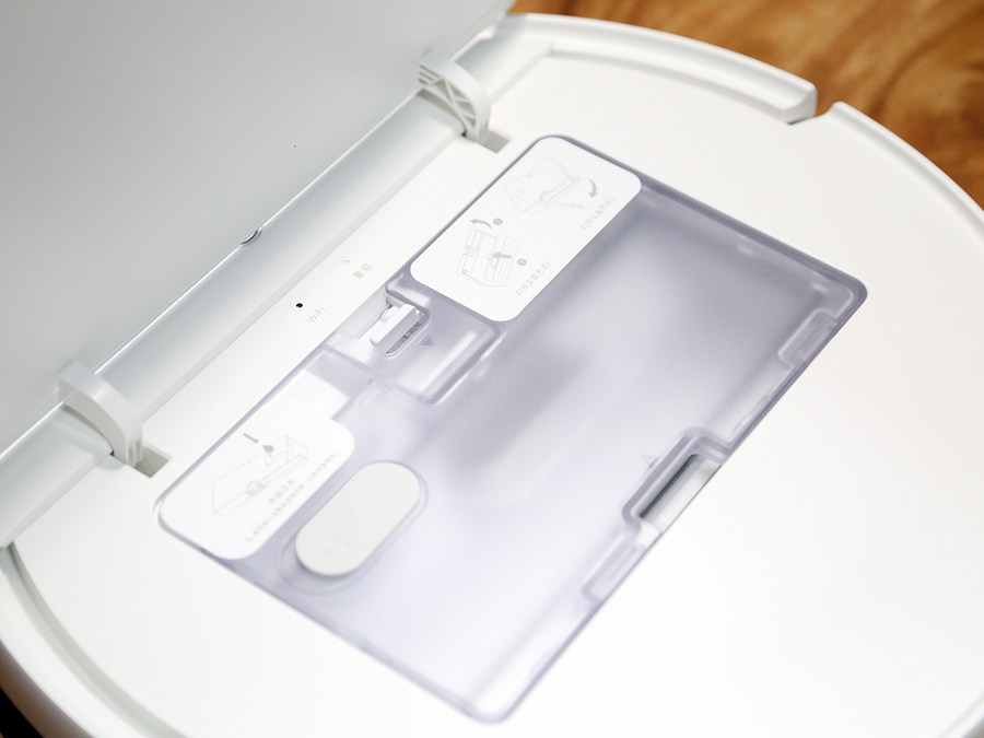打开米家扫拖机器人G1的顶盖就可以看到尘盒,米家扫拖机器人G1的尘盒和水箱是在一起的,在顶部可以看到注水口。