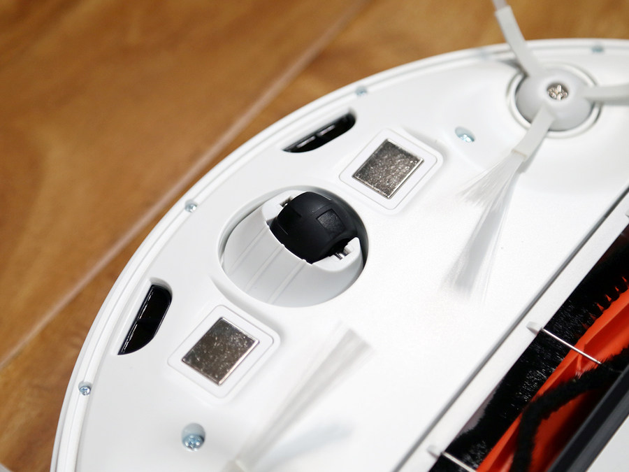 将米家扫拖机器人G1翻转过来,可以看到其底部的设计。米家扫拖机器人G1配备了一个万向轮,用于控制机器的运行方向,在旁边的两个金属触点就是充电器的触点。