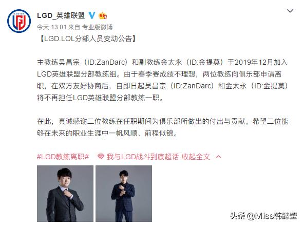 LGD主教练吴昌宗(ID:ZanDarc)和副教练金太永(ID:金提莫),由于春季赛成绩不理想所以向俱乐部申请离职。