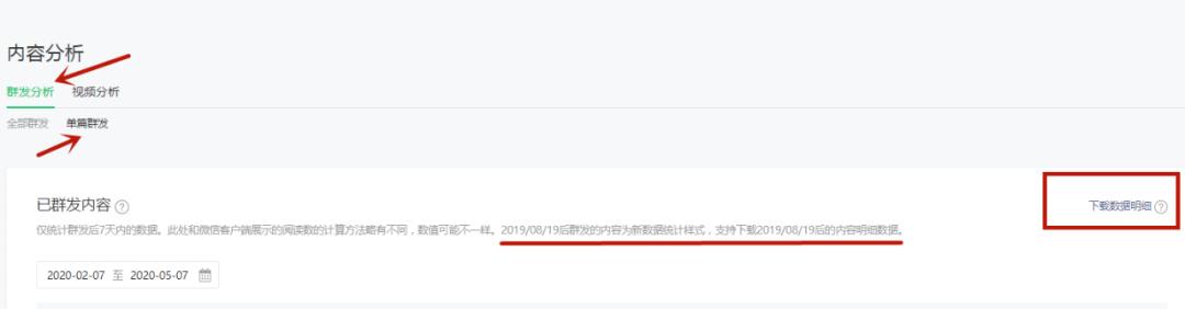 不用再借助第三方插件,公众号后台可以直接批量导出内容分析的数据。运营者在登陆后台页面后,进入“统计”-“内容分析”-“单篇群发”-“下载数据明细”,便能选择下载时间跨度不超过3个月的分析数据。(目前仅支持下载2019/08/19后的内容明细数据)